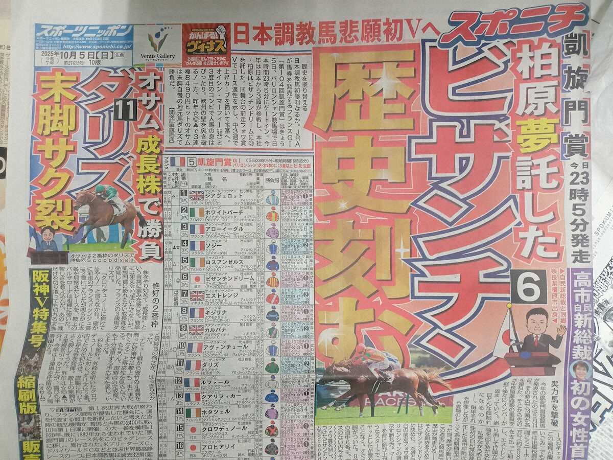 スポニチ1面(西日本版)予想でズバッと仕留めたのがオサムだ。10番人気の勝ち馬ダリズから2番人気ミニーホークが2着、5番人気ソジーが3着に入って◎○▲で3連単11万2570円!馬券圏外ながら13番人気4着ジアヴェロットに☆(4番手評価)を入れていた。