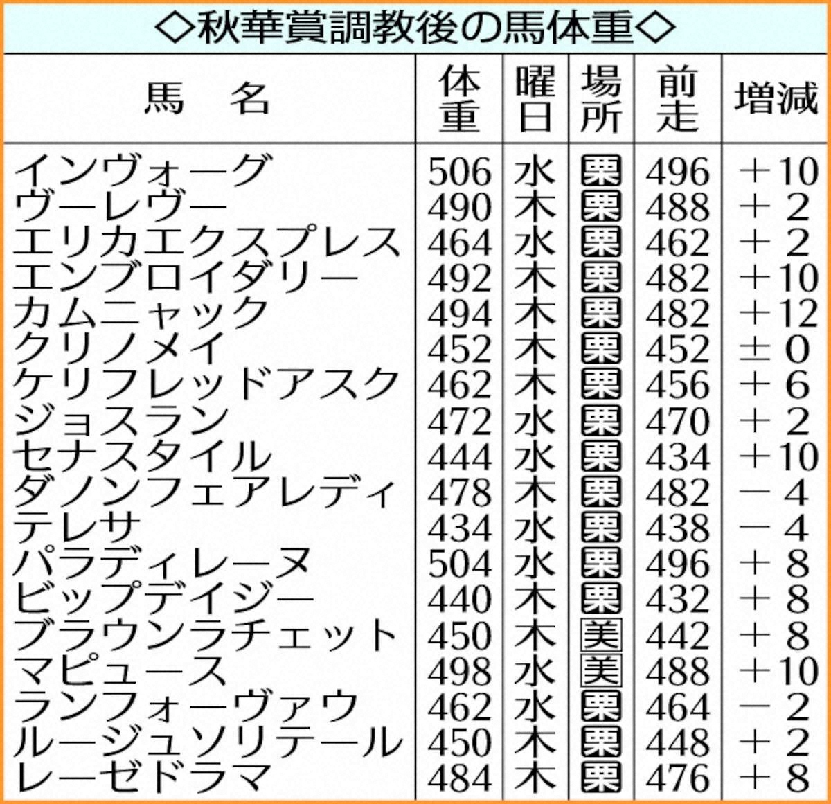 JRAは16日、秋華賞出走馬の調教後馬体重を発表した。