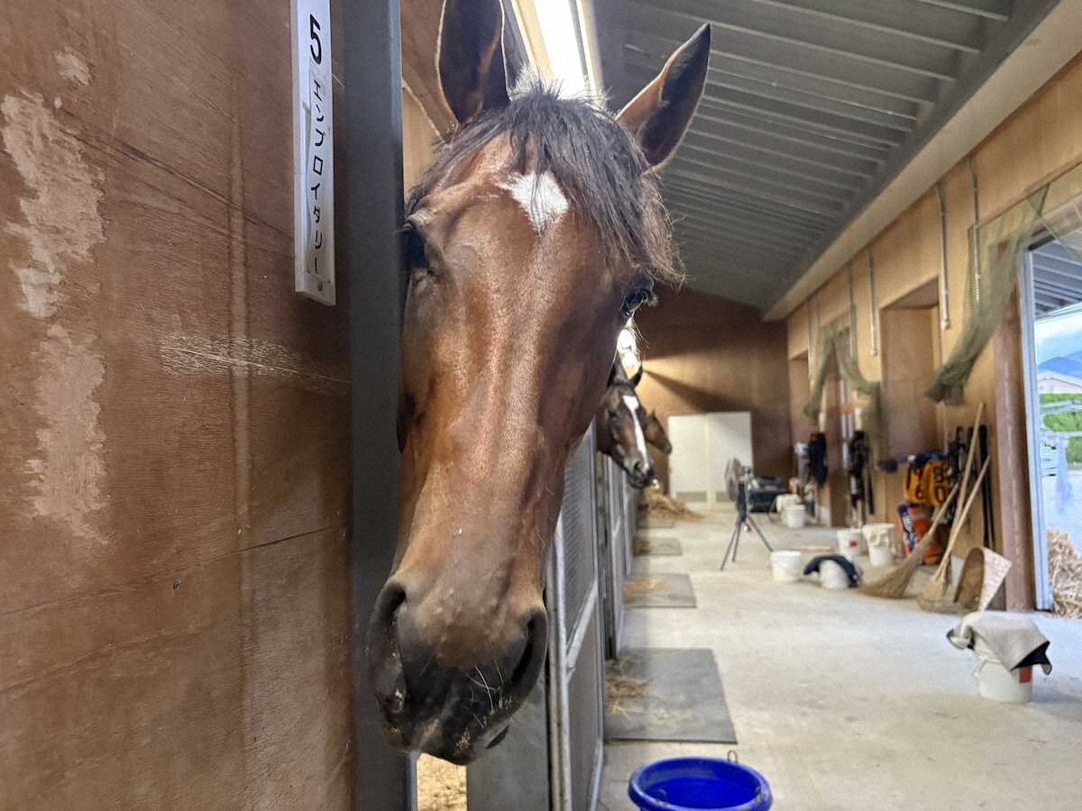 秋華賞から一夜明けて栗東トレセンで静養するエンブロイダリー