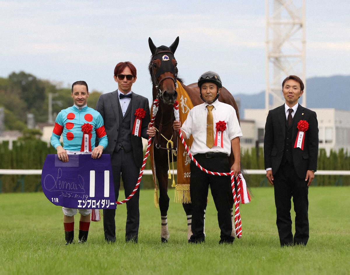 秋華賞を制したエンブロイダリーとルメール(左)、森一誠師(右)と厩舎スタッフ