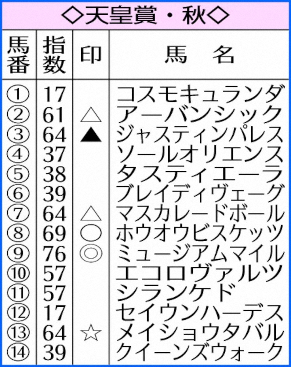 東京メインの2歳G2「京王杯2歳S」をピックアップ。指数トップ(83)に指名したのはダイヤモンドノット。千二→千四の距離延長でレース内容が一変。未勝利戦は3馬身差の楽勝。前走もみじSはスローで逃げた勝ち馬を捉え切れずの2着も、後続には5馬身差。上がり3Fは最速33秒3で、勝ち馬を0秒9上回った。
