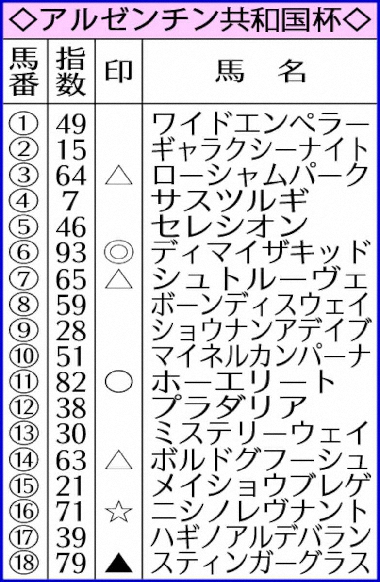 本日は荒れるハンデG2「アルゼンチン共和国杯」を予想。今年も難解と思いきや、AIはメンバーの序列を明示。指数トップ93はディマイザキッドで、なかなかお目にかかれない90点台。2番手ホーエリートに11点差をつけた。前走の毎日王冠で強豪相手に4着と健闘。振り返れば東京では3歳時の共同通信杯で、後のG1馬(ジャスティンミラノ、ジャンタルマンタル)に食い下がった。初距離だが2200メートルで【1・0・1・0】なら克服可能とジャッジ。買い目は◎から○▲☆と△全てへの6点と、○▲1点を押さえる計7点。