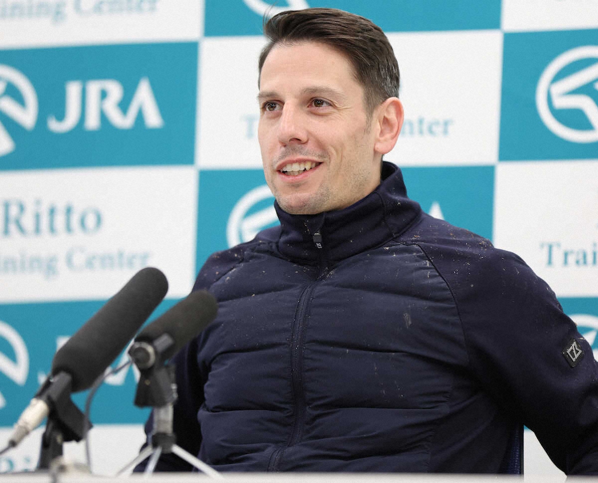 共同会見に臨むソウルラッシュ騎乗のC・デムーロ騎手(撮影・中辻 颯太)