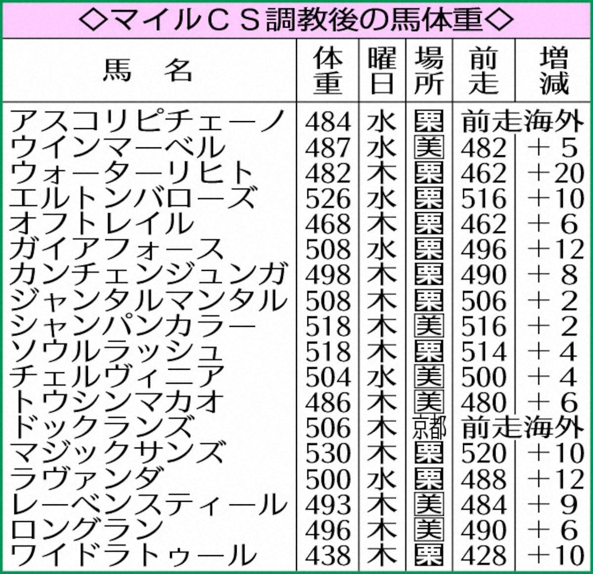 JRAは20日、マイルCS出走馬の調教後馬体重を発表した。ジャンタルマンタルは前走比2キロ増と安定した馬体重。万全の仕上がりだろう。アスコリピチェーノは484キロで2走前のヴィクトリアMと比べて8キロ増となっている。