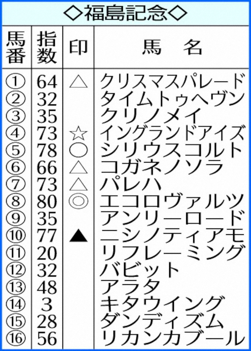 3日間開催の初日は「福島記念」をピックアップ。毎年難解なハンデG3らしく、AIも“上位混戦”の見立て。わずかな差で指数トップ(80)に指名したのはエコロヴァルツ。重賞では白星こそないが、今春のG1大阪杯で小差4着など何度も好走。ノンタイトルながらトップハンデ(58・5キロ)を背負った実力を素直に評価した。