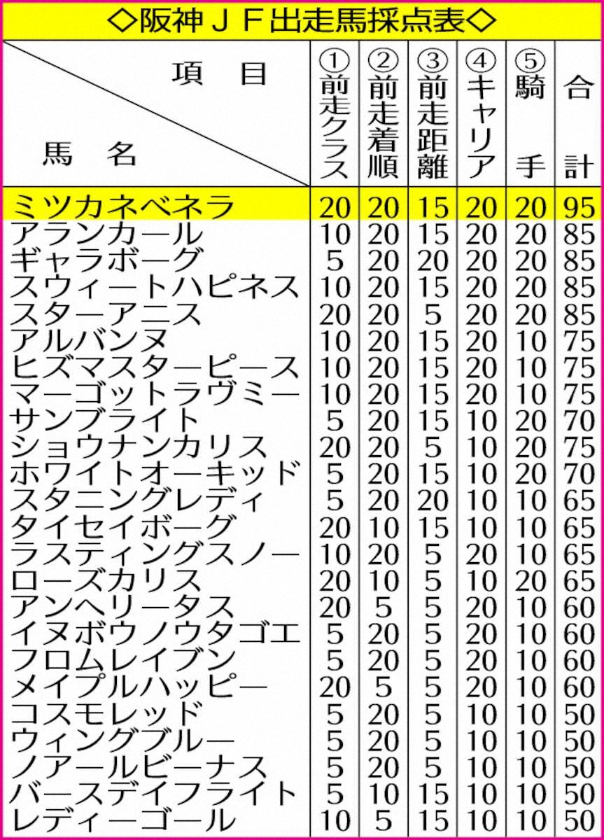 4項目で満点を獲得したミツカネベネラを本命に推す。5勝を挙げているアルテミスS(2着)からの臨戦は心強い。キャリア2戦で上積みも十分。鈴木伸厩舎のG1初Vに期待する。(データ班)