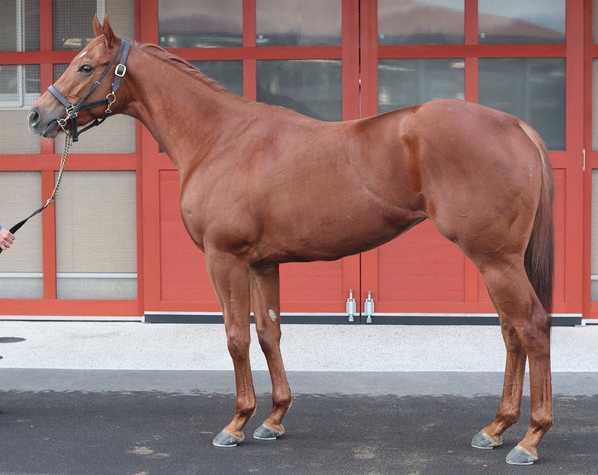 460キロ前後の体重以上に大きく見せます。胸前とトモに大きな筋肉を備え、後膝はビッグサイズ。「大」の馬体です。前進気勢がかなり強い立ち姿。マイルはぎりぎりでしょう。
