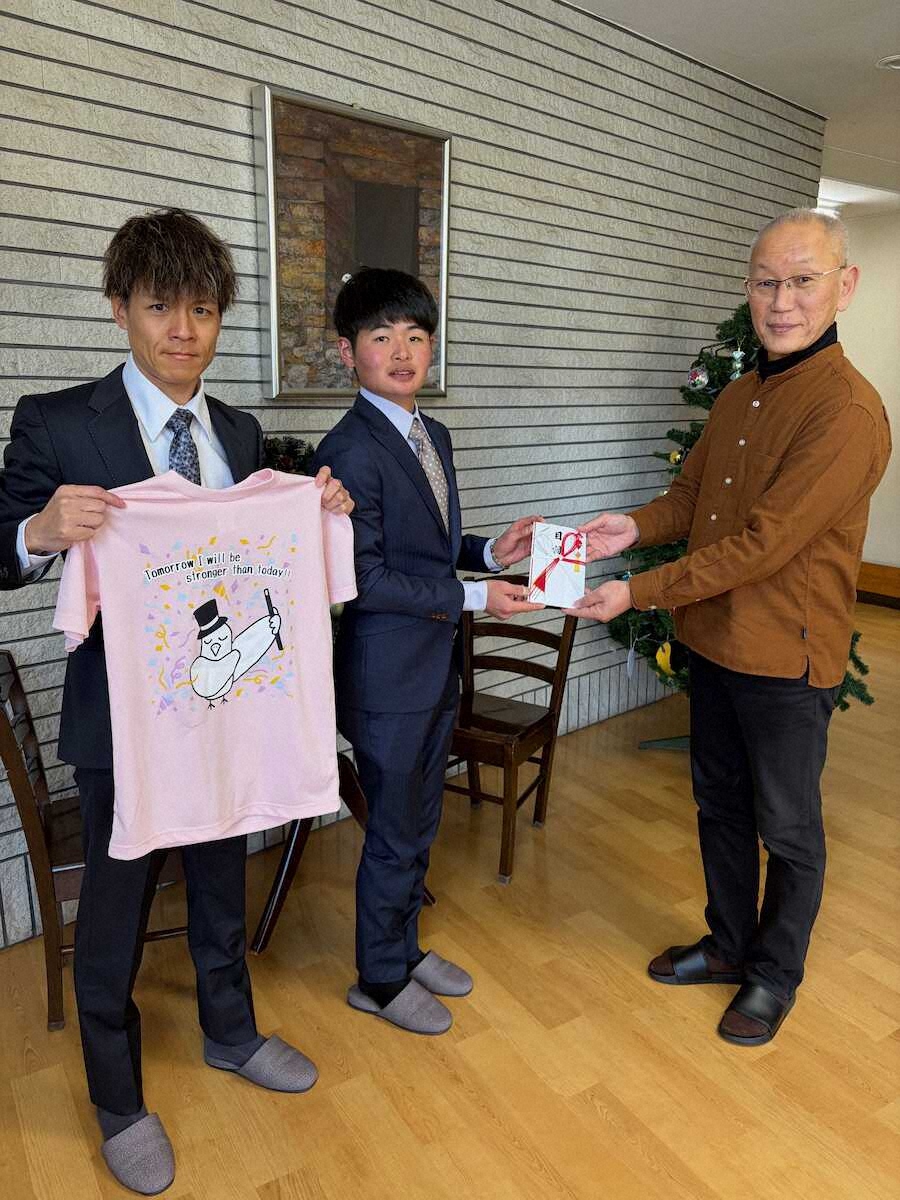 滋賀県大津市の児童養護施設「小鳩の家」で10日、高田潤(45)と田口貫太(22)による寄付金贈呈式が行われ、チャリティーTシャツの売上金12万5000円を同施設に寄付した。
