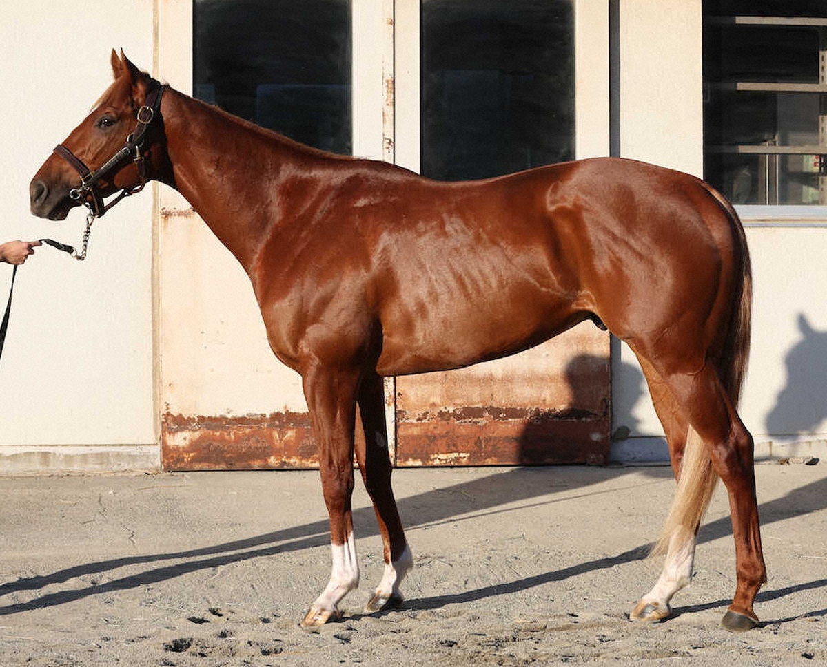 涼しげな顔つきからは穏やかな気性がうかがえる。気性はしばしば距離の壁を越えるものです。体形はマイルですが、この気性なら中距離もこなせるかもしれません。ともあれ、マイル戦の今回は任せてくれ!と訴えてくるような体つき。冬の優しい日差しを浴びて栗毛の被毛が輝いています。体調も申し分ありません。