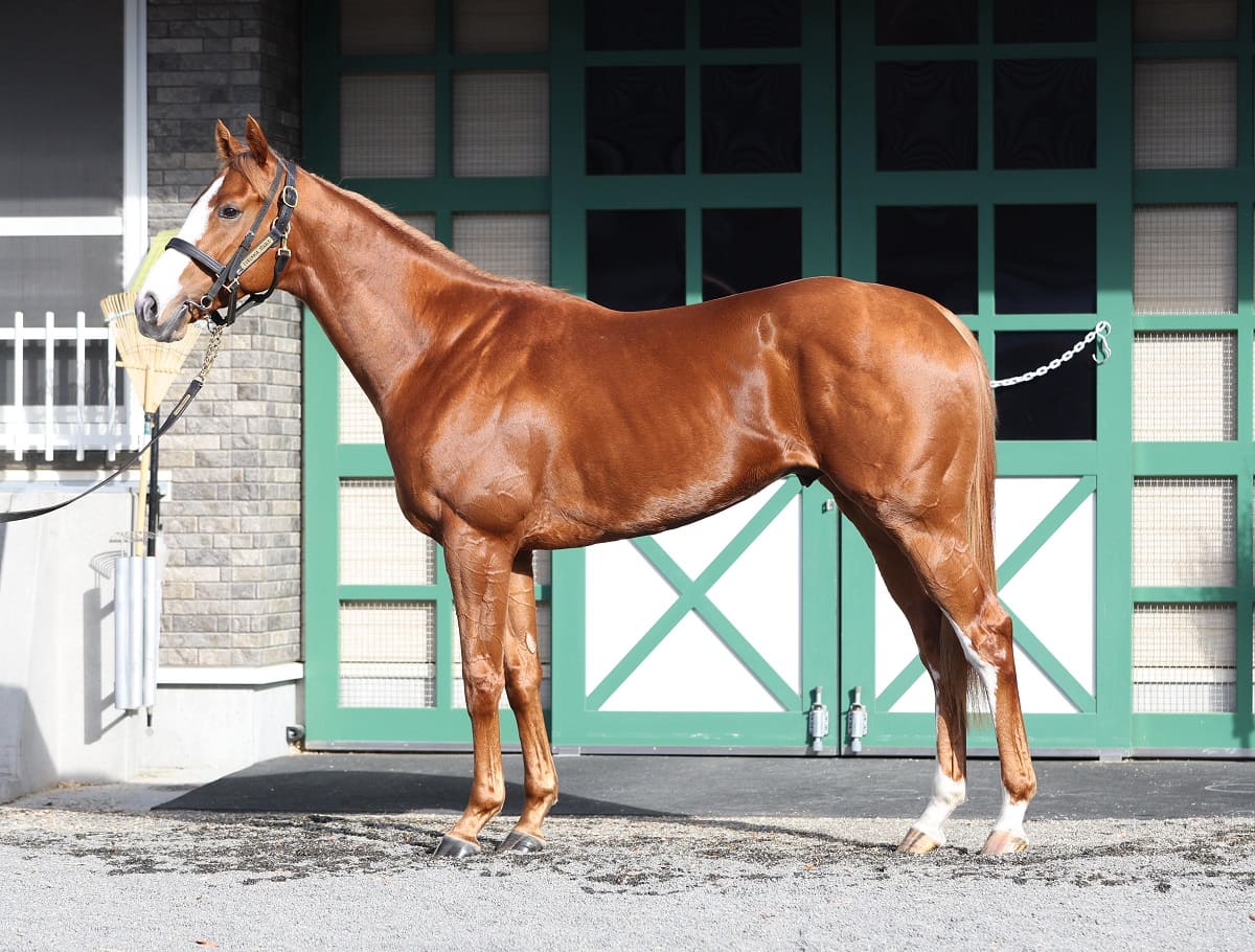1200〜1400メートル戦に使われてきましたが、体形からはマイルの方が適している。毛ヅヤも良好。筋肉にはパワーをつける余地があります。腹周りももう少しふっくらしてほしい。