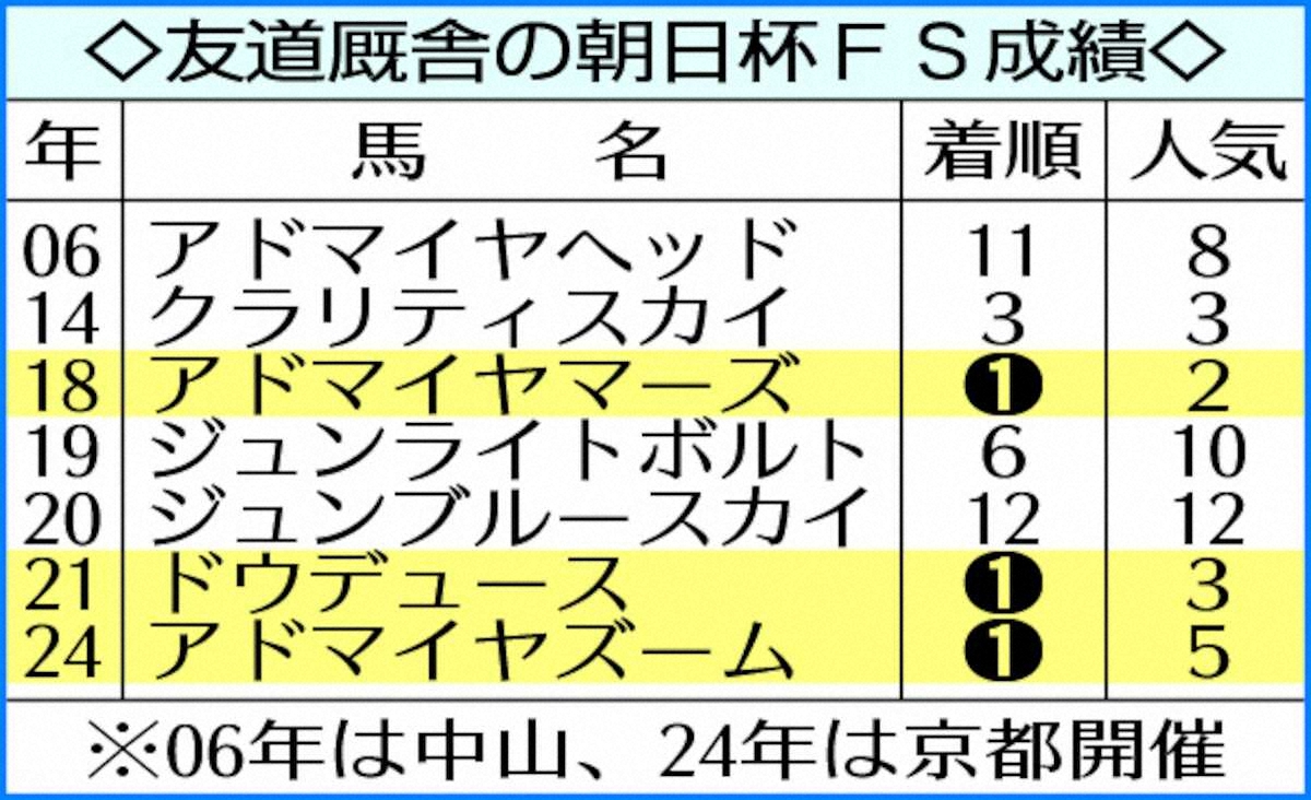 朝日杯FSはレース名が朝日杯3歳Sで距離が1100、1200メートルだった創設(49年)当初からカウントすると尾形藤吉師が最多5勝をマークしているが、1600メートルになった62年(第14回)以降に限定すれば当レース3勝は高松三太師と友道師の2人だけ。友道師が昨年アドマイヤズームに続く連覇&同一G1・4度目Vの偉業にチャレンジする。