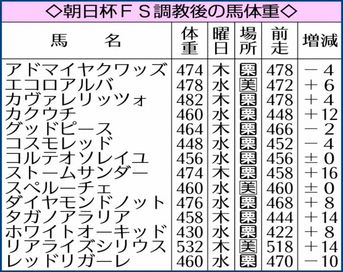 JRAは18日、朝日杯FS出走馬の調教後馬体重を発表した。