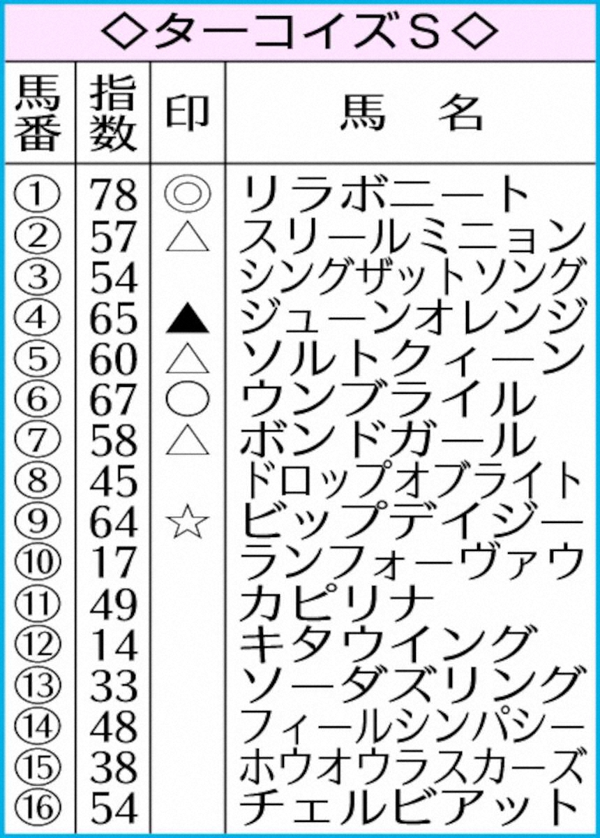 ターコイズSは重賞としての歴史こそ浅いが、80年代から続く師走中山の名物競走。難解な牝馬のハンデ戦だが、AIはズバッとリラボニートを1位指名(指数78)。