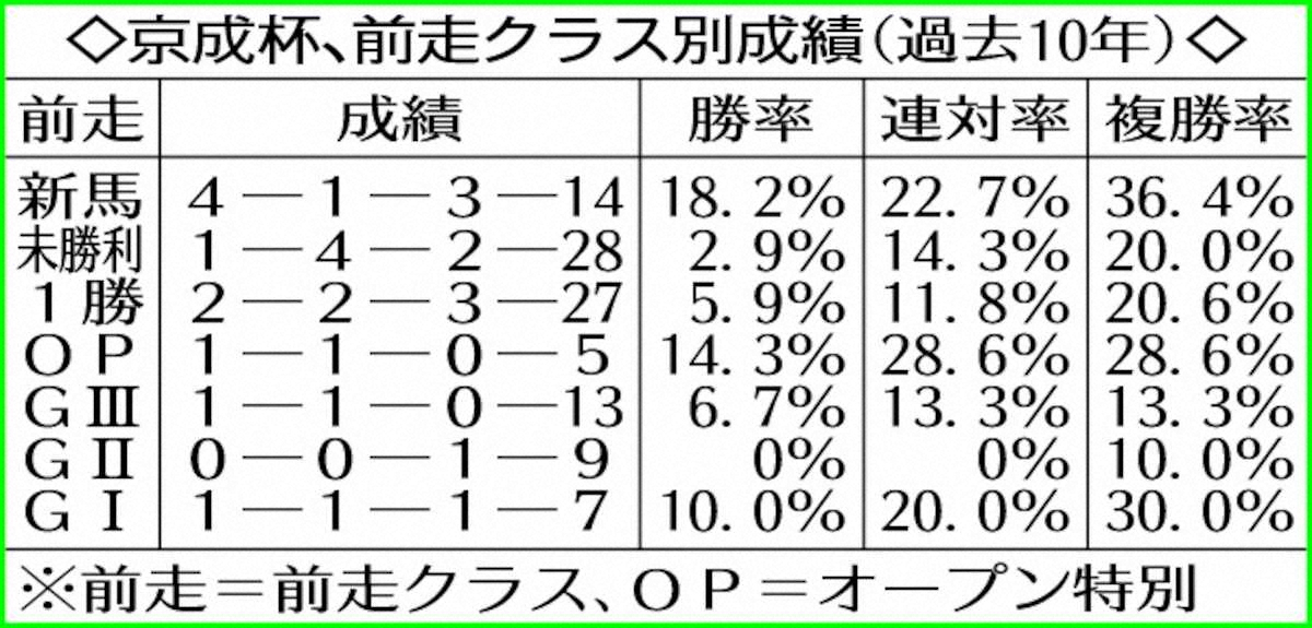 ≪ステップ≫前走新馬勝ち上がり組が強いのは前項目で書いた。これが未勝利勝ちとなると【1・4・2・28】で勝率わずか2・9%になる。1勝クラスでは葉牡丹賞組が好成績。【2・1・1・3】で勝率28・6%、連対率42・9%を誇る。同舞台だけに経験が強みになるようだ。ホープフルS組は【1・0・2・7】で優勝は22年オニャンコポンのみ。