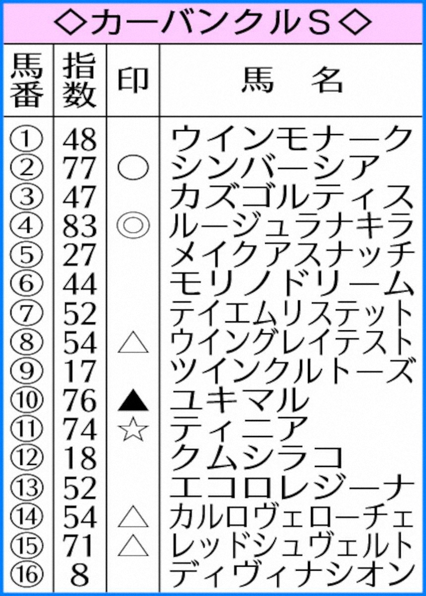 中山メインのカーバンクルSはルージュラナキラを指数83でトップ評価とした。中山芝1200メートルは直近2戦で1→3着。2走前のセプテンバーSは1分7秒0の好時計で2着に0秒2差の完勝と言える内容。昇級戦の前走ラピスラズリSも、オープン実績十分の2頭に次ぐ3着。確かな舞台適性を示すとともに、オープンでも通用する地力をアピールした。ハンデ54キロ止まりなら好走確実とのジャッジだ。