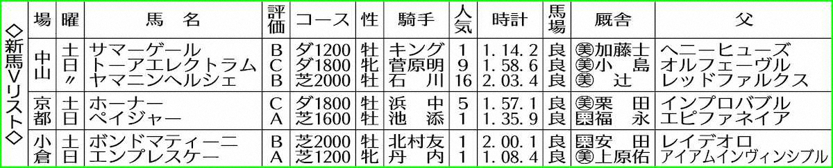 小倉では芝1200メートル戦のエンプレスケーが強かった。スタートは遅かったが、二の脚が速くハナへ。最後まで楽な手応えのまま、2着に1馬身半差つけた。スピード性能は抜群で、時計も文句なし。完成度はかなり高い。中山芝2000メートル戦のヤマニンヘルシェは、人気薄ではあったものの勝ちっぷりは上々。ラスト2Fは11秒3→11秒3と優秀だった。