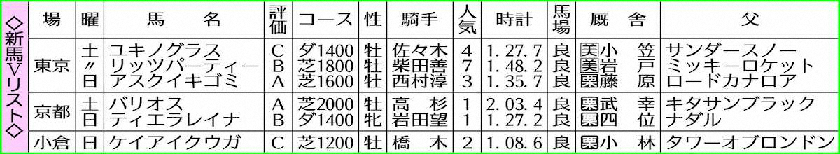 京都芝2000メートルはバリオスが外から鮮やかな差し切りV。メンバー最速の上がり3F34秒3をマークし、2着馬を首差捉えた。テンションに課題を残しつつも脚力が非凡。半兄に10歳の現役オープン馬ヘリオスがいる。伸びしろが大きく、長く活躍できそうだ。