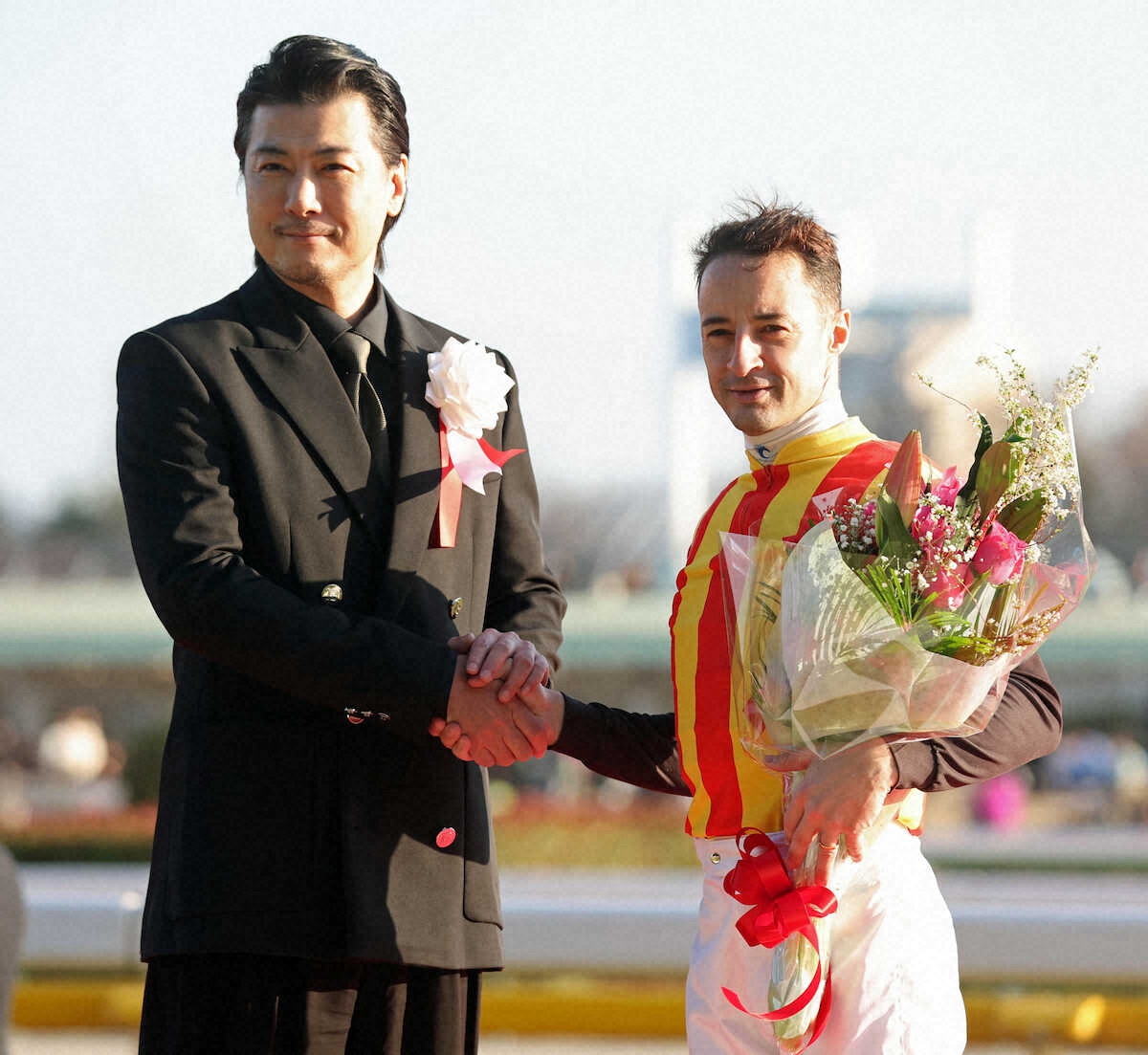 <東京11R・フェブラリーS>表彰式のプレゼンターを務めた玉山鉄二(左)と握手するルメール (撮影・村上 大輔)