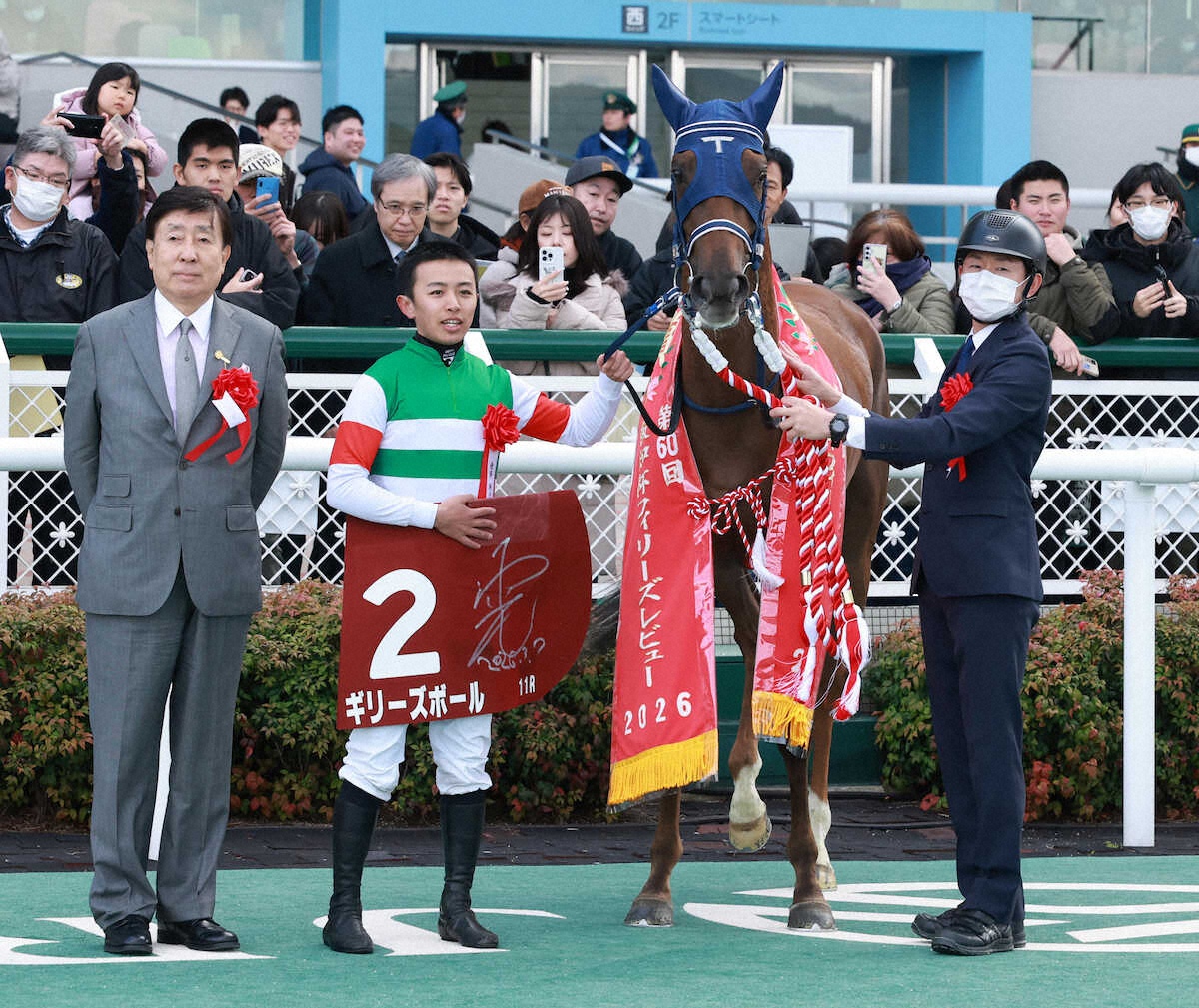 3枚の桜花賞切符を懸けたトライアル「第60回フィリーズレビュー」(G2)は7日、阪神競馬場の芝1400メートル(内回り、良馬場)を舞台に18頭で争われ、2番枠から中団のインで脚をためた西塚洸二(21)騎乗のギリーズボール(牝3=手塚久、父エピファネイア)が直線、内からズバッと差し切りV。デビュー2戦目の前走フェアリーS13着を糧にし、重賞初制覇を飾った。