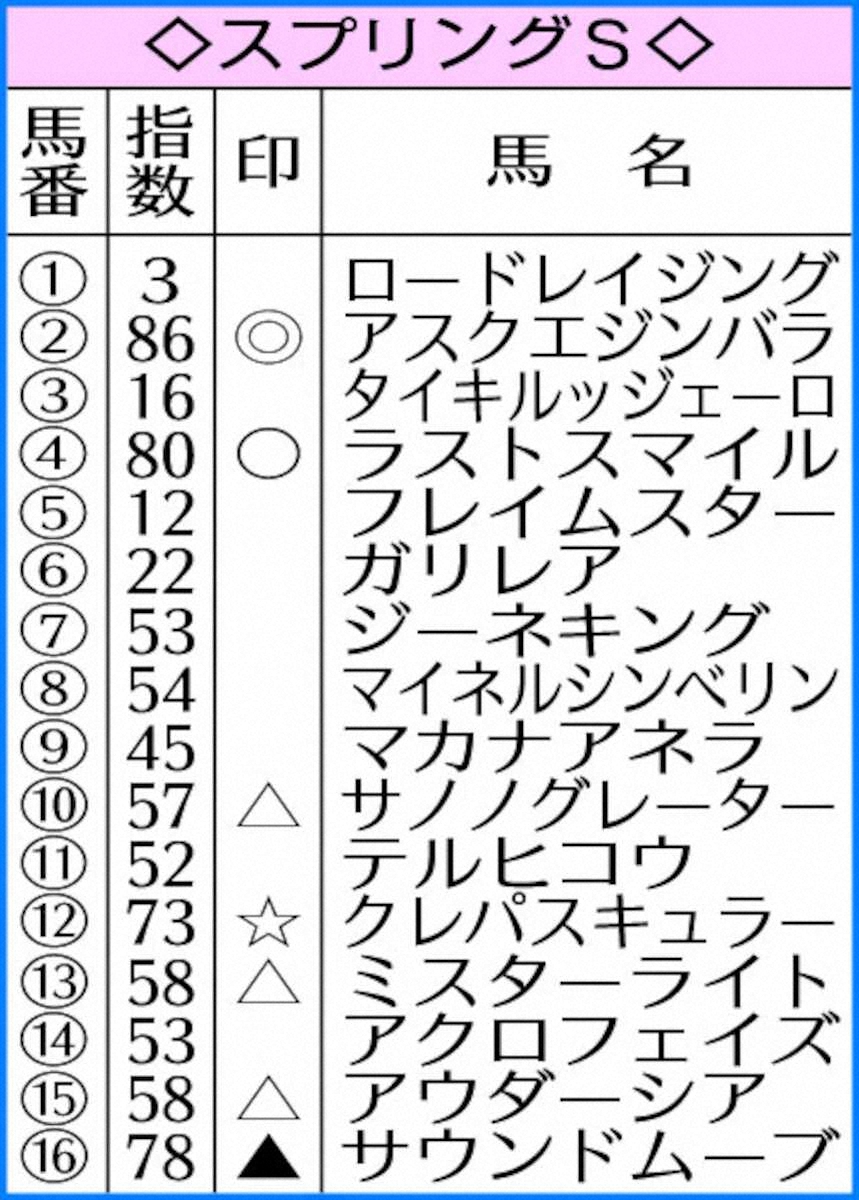 皐月賞切符3枚を懸けた中山11R・スプリングSは、アスクエジンバラを指数トップ86で◎に指名した。メンバー中唯一のオープン(コスモス賞)勝ち馬。G3京都2歳S2着、G1ホープフルS3着とハイレベルな重賞戦線でも着実に上位争いをしてきた。加えて1800メートルは2戦2勝。メンバー最上位と言える実績を素直に評価した。