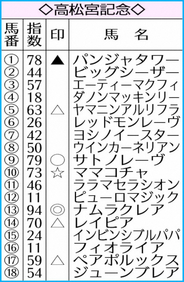 指数94は連覇が懸かる2位サトノレーヴに15ポイント差をつける断トツの数字。当レース3年連続2着を含み、芝1200メートルのG1では【0・3・3・1】。唯一の着外は3歳時のスプリンターズS5着。この条件では4歳春以降、一度も馬券圏内を外していない。馬連派のAIにとっては、まさに“堅軸”だ。