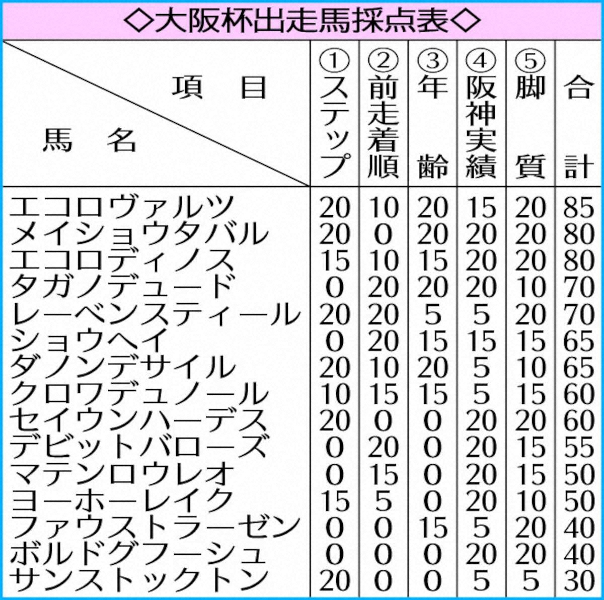 【結論】混戦を反映するように、採点も割れた。わずかにリードしたのはG1初制覇を狙うエコロヴァルツで85点。好ステップの中山記念組で「前走3着」も許容範囲。阪神は23年朝日杯FS(2着)でマイル王ジャンタルマンタルに続いた実績が光る。昨年の大阪杯(4着)は4角10番手から惜しくも届かなかったが、前走の中山記念で「1〜4角3番手」と大阪杯向きの先行力を磨いているのもいい。ただ、2番手との差は5点。昨年の宝塚記念優勝馬メイショウタバルも好ステップの有馬記念組。阪神実績、先行力は言うまでもない。急激に力をつけたエコロディノスは好走例の多い京都記念組で阪神巧者+逃げも辞さない脚質。同馬主ヴァルツとの“エコロ丼”もあるかも? (データ班)