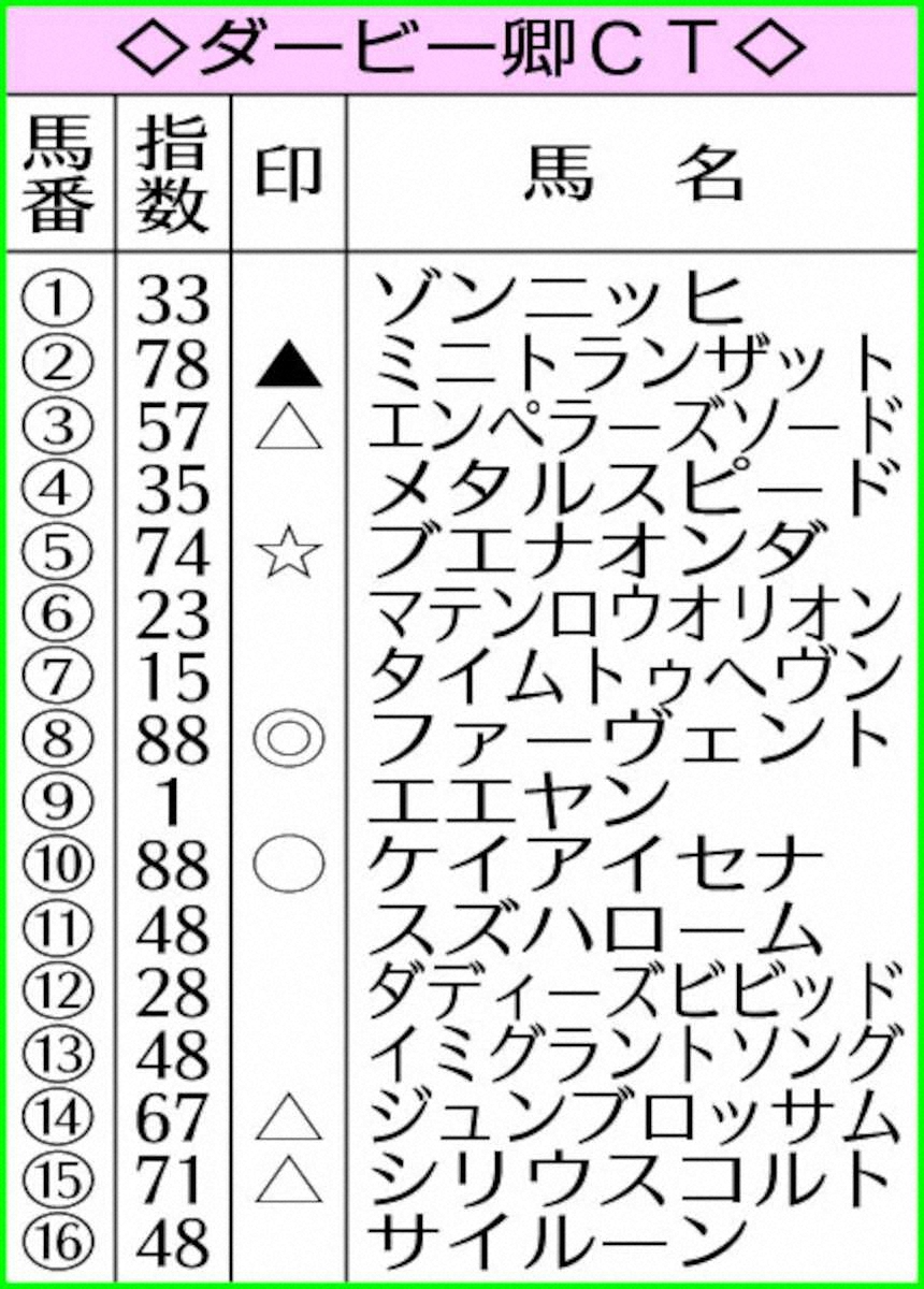 2番手はケイアイセナで指数88は◎と同点と互角のジャッジ。こちらも前走小倉大賞典の2着好走を高く評価した。