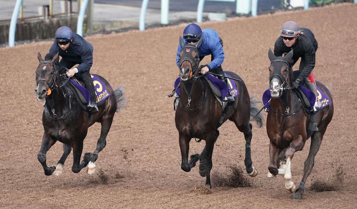 これほど豪華なG1の最終追いは異例中の異例だ。雨上がりの美浦Wコースに、G1出走馬のみが装着する特殊ゼッケンの3頭、8→17→15が隊列を組んで登場。報道陣の緊張は一気に高まった。