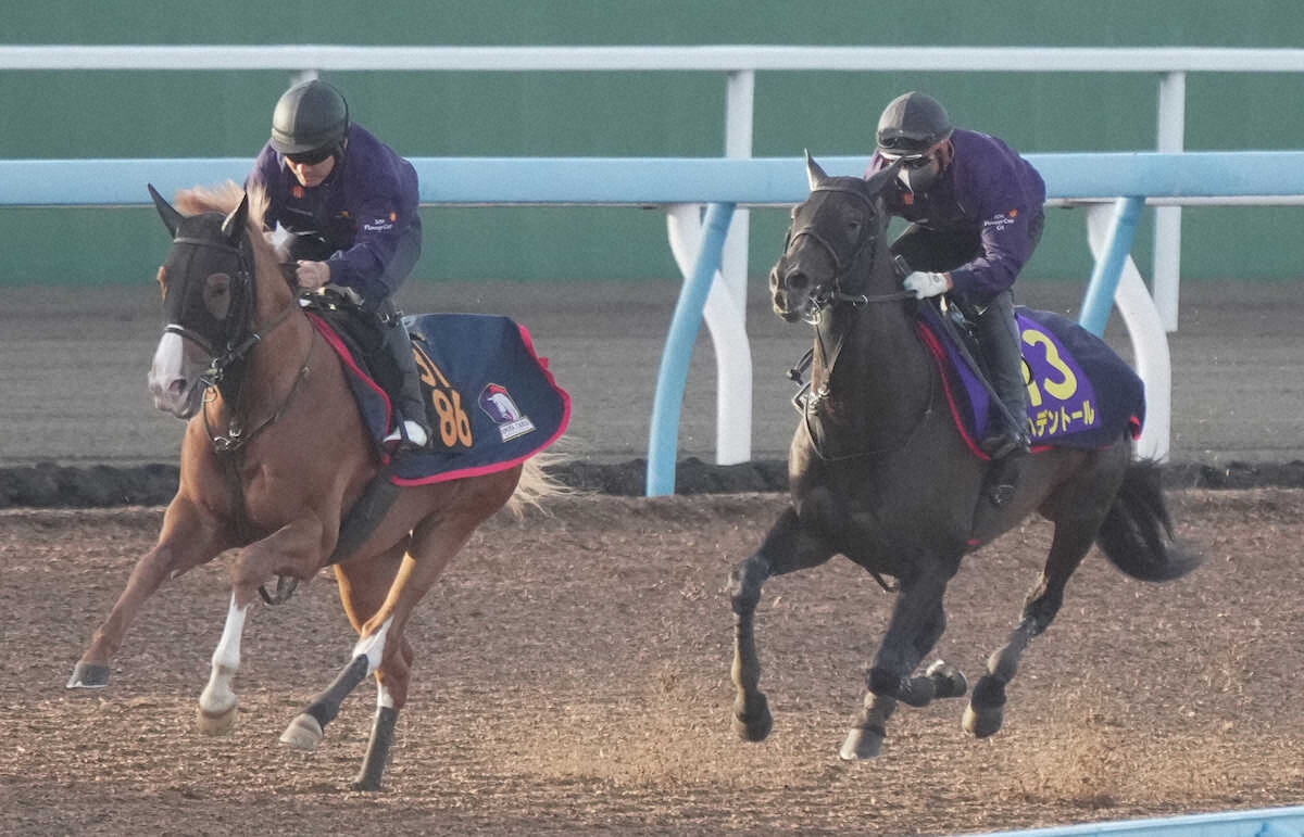 併せ馬で追い切るヘデントール(右)