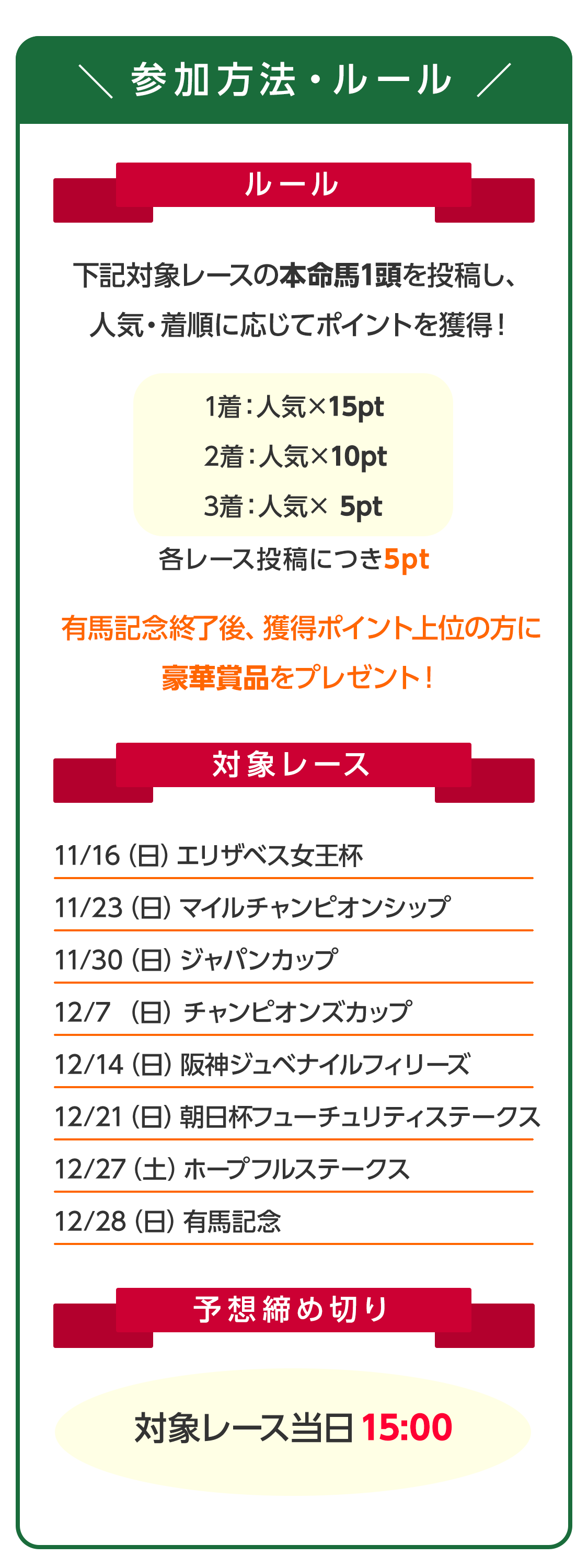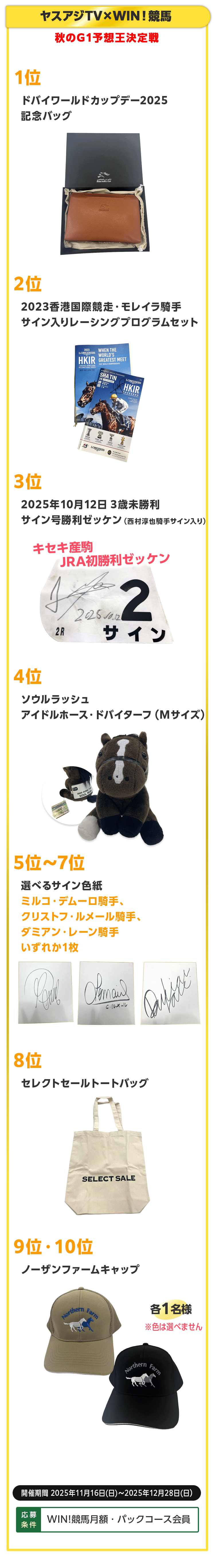 いつも「WIN!競馬」をご利用いただきありがとうございます。WIN!競馬では2025年11月16日(日)~12月28日(日)の期間中「ヤスアジTV×WIN!競馬 秋のG1予想王決定戦」キャンペーンを実施いたします。エリザベス女王杯から有馬記念まで毎週開催されるG1の本命馬を予想して、豪華賞品をゲットしましょう!