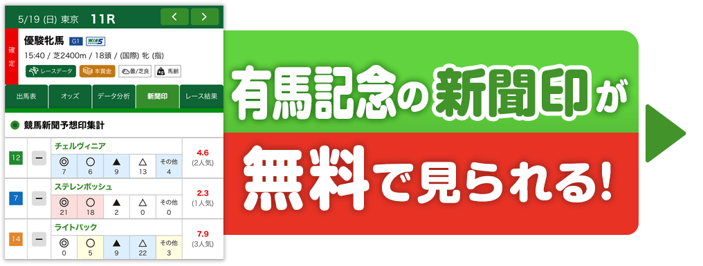 | 2 | 6 | サージェントバッジ | 牡4 | 2 | クビ | ⑫⑬⑪⑫ | 武豊 | 須貝尚介 | |